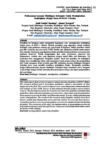 Harahap, Jumli Sabrial and Syarqawi, Ahmad (2023) Pelaksanaan Layanan Bimbingan Kelompok Untuk Meningkatkan Kedisiplinan Belajar Siswa Di MAN 1 Medan. G-COUNS: Jurnal Bimbingan dan Konseling, 7 (2). ISSN p-2541-6782, e-ISSN 2580-6467