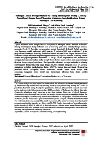 Siregar, Siti Rahmadanti and Harahap, Ade Chita Putri (2023) Hubungan Antara Persepsi Mahasiswa Tentang Pembelajaran Daring (Learning From Home) Dengan Love Of Learning Mahasiswa Serta Implikasinya Dalam Bimbingan Dan Konseling. G-COUNS: Jurnal Bimbingan dan Konseling, 7 (2). ISSN p-2541-6782, e-ISSN 2580-6467