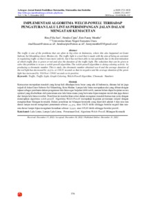 Sari, Rina Filia and Cipta, Hendra and Munthe, Esto Fanny (2022) Implementasi Algoritma Welch-Powell terhadap pengaturan lalu lintas persimpangan jalan dalam mengatasi kemacetan. Lebesgue: Jurnal Ilmiah Pendidikan Matematika, Matematika dan Statistika, 3 (3). ISSN P-2721-8929, E-2721-8937