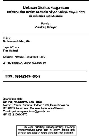 Ziaulhaq, Ziaulhaq (2022) Melawan Otoritas Keagamaan: Referensi dari Tarekat Naqsyabandiyah Kadirun Yahya (TNKY) di Indonesia dan Malaysia. Penerbit: CV. Putra Surya Sentosa, Sleman. ISBN 978-623-494-085-5