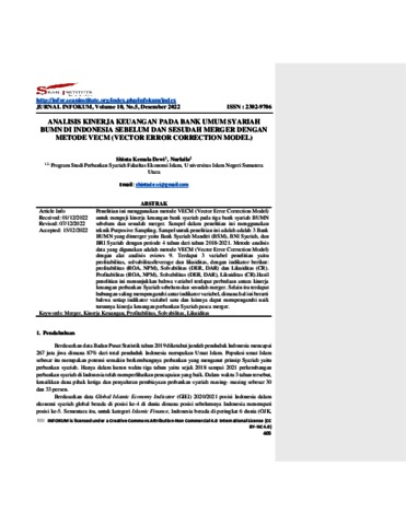 Dewi, Shinta Kemala and Nurlaila, Nurlaila (2022) Analisis kinerja keuangan pada Bank Umum Syariah BUMN di Indonesia sebelum dan sesudah merger dengan Metode VECM (Vector Error Corection Model). Jurnal Infokum, 10 (2). ISSN 2302-9706