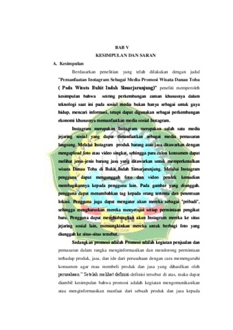 Penelitian ini berjudul “Pemanfaatan Instagram Sebagai Media Promosi Wisata Danau Toba (Pada Wisata Bukit Indah Simarjarunjung)”. Penelitian ini bertujuan untuk mengetahui pemanfaatan media sosial yang dilakukan oleh pihak Bukit Indah Simarjarunjung dalam promosi wisatanya. Teori yang peneliti gunakan dalam penelitian ini adalah teori New Media. Peneliti menggunakan metode penelitian kualitatif dengan pendekatan fenomenologi. Hasil dari penelitian ini menunjukkan bahwa pihak Bukit Indah Simarjarunjung dalam memanfaatkan Instagram sebagai media promosi dengan cara mengupload atau mengunggah foto dan video terbaru yang diolah secara Instagramable agar yang melihat postingan tersebut tertarik untuk berkunjung ke tempat wisata tersebut. Pihak Instagram Bukit Indah Simarjarunjung juga memposting ulang foto atau video dari para pengunjung yang telah mengunjungi tempat wisata tersebut dengan menggunakan hastag atau tagar Bukit Indah Simarjarunjung. Pihak Bukit Indah Simarjarunjung juga membuat sorotan pada akun Instagram mereka agar yang melihat dapat mengetahui sebelumnya apa saja yang ada di tempat wisata tersebut. Pihak Bukit Indah Simarjarunjung melakukan promosi melalui media sosial Instagram dikatakan berhasil dengan meningkatnya jumlah pengunjung wisata Bukit Indah Simarjarunjung dan meningkatnya jumlah pengikut pada akun Instagram Bukit Indah Simarjarunjung.