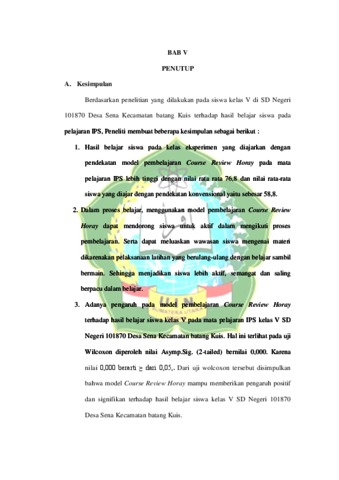 Penelitian ini bertujuan untuk mengetahui (1) Pengaruh model pembelajaran Course Review Horay terhadap hasil belajar IPS siswa kelas V (2) Hasil belajar IPS siswa yang diajar dengan model pembelajaran konvensional (3) Pengaruh model pembelajaran Course Review Horay pada mata pelajaran IPS kelas V SD Negeri 101870 Desa Sena Kecamatan Batang Kuis. Penelitian ini merupakan penelitian kuantitatif dengan jenis quasi eksperimen. Populasi dalam Penelitian adalah seluruh siswa kelas V SD Negeri 101870 Desa Sena Kecamatan Batang Kuis yang berjumlah 50 siswa dan sampelnya adalah kelas V-A dan kelas V-B yang berjumlah 50 siswa. Instrumen test yang digunakan untuk mengetahui hasil belajar adalah test pilihan berganda. Analisis data dilakukan dengan menggunakan uji Wilcoxon dengan bantuan SPSS versi 22. Hasil Temuan ini menunjukkan bahwa : (1) Siswa yang diajarkan dengan model Course Review Horay pada mata pelajaran IPS lebih baik dibandingkan dengan model konvensional dengan nilai rata rata 76,8 (2) Hasil belajar siswa dalam mata pelajaran IPS dengan pendekatan konvensional memperoleh nilai rata-rata yaitu sebesar 58,8 (3) Ada pengaruh yang signifikan antara Model pembelajaran Course Review Horay terhadap hasil belajar siswa pada mata pelajaran IPS kelas V SD Negeri 101870 Desa Sena Kecamatan Batang Kuis dengan hasil uji hipotesis Asymp.Sig. (2-tailed) bernilai 0,000. Karena nilai 0,000 berarti ≥ dari 0,05, maka dapat disimpulkan bahwa “Ho ditolak dan Ha diterima.