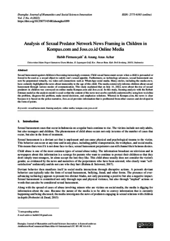 Sexual harassment against children is becoming increasingly common. Child sexual harassment occurs when a child is persuaded or forced to be used as a sexual object to satisfy one's sexual appetite. Furthermore, as technology advances, sexual harassment can now be perpetrated virtually, via video call connections such as WhatsApp social media. Many circles, including the media crew, have certainly highlighted the news about immorality to the age of this child. The media extensively informs children about sexual harassment through various modes of communication. This study explained that on July 14, 2022, news about the rise of sexual predators in children was conveyed on online media Kompas.com and Joss.co.id. In this study, framing analysis with the Robert Entman model as the analysis model is used so that the content of the news text can be carefully understood by using how to define the problem, diagnose the problem, make moral decisions, and emphasize solutions. Whereas in Kompas.com, the news is clear because it is based on the police narrative, Joss.co.id provides information that is profiteered from other sources and developed in the form of points.