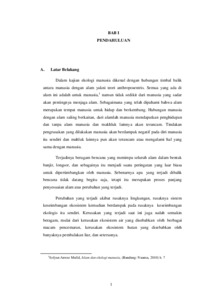 Skripsi ini membahas tentang Dimensi Ekologi Dalam Penafsiran Alquran Surah ArRum Ayat 41 Dan Al-A‟raf Ayat 56 Studi Kitab Tafsir Al-Misbah Karya Muhammad Quraish Shihab. Diangkatnya judul skripsi ini terinspirasi dari banyaknya terjadi pada kerusakan alam seperti banjir, tanah longsor, dan sebagainya di bumi ini baik di negeri kita Indonesia maupun di luar negeri. Kejadian ini menjadi peringatan yang luar biasa untuk dipertimbangkan oleh manusia. Namun tidak sedikit dari manusia yang sadar akan pentingnya menjaga alam. Sebagaimana yang telah dipahami bahwa alam merupakan tempat manusia untuk hidup dan berkembang. Hubungan manusia dengan alam saling berkaitan, dari alamlah manusia mendapatkan penghidupan dan tanpa alam manusia dan makhluk lainnya akan terancam. Tindakan manusia terhadap alam akan berdampak negatif pada diri manusia itu sendiri dan mahluk lainnya pun akan terancam atau mengalami hal yang sama dengan manusia.Untuk itu diperlukan kajian ilmiah bagaimana cara manusia agar terhindar dari kerusakan alam. Dan di dalam Alquran terdapat ayat yang membahas tentang kelestarian alam tepatnya di surah ar-Rum ayat 41 dan al-A‟raf ayat 56. Kemudian peneliti menggunakan tafsir al-Misbah yang yang ditulis oleh mufassir yaitu Prof. Muhammad Quraish Shihab. Jenis penelitian yang digunakan peneliti dalam penulisan skripsi ini yakni berbentuk penelitian kepustakaan (library research) yakni merupakan studi yang digunakan dalam mengumpulkan informasi dan data dengan bantuan berbagai macam material yang ada di perpustakaan seperti dokumen-dokumen, buku-buku, majalah, jurnal, skripsi, tesis, disertasi, dan sebagainya. Penelitian inni juga termasuk kedalam metode kualitatif. Penelitian kualitatif adalah penelitian yang bersifat deskriptif dan cenderung menggunakan analisis. Dengan demikian, hasil dari penelitian ini adalah untuk menjeaskan kajian dimensi ekologi menganai kelestarian alam yang terjadi di bumi ini, sekaligus mengetahui makna ayat didalam Alquran mengenai kelestarian alam dengan penafsiran al-Misbah karya Prof. Muhammad Quraish Shihab pada surah ar-Rum ayat 41 an al-A‟raf ayat 56. Bahwa kelestarian alam yang terjadi dibumi ini disebabkan oleh tanan manusia itu sendiri