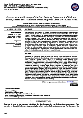 Wahyu, Muhammad and Sikumbang, Ahmad Tamrin (2022) Communication Strategy of the Deli Serdang Department of Culture,Youth, Sports and Tourism in Increasing Post-Covid-19 Tourist Visits. Legal Brief, 11 (3). ISSN 2722-4643