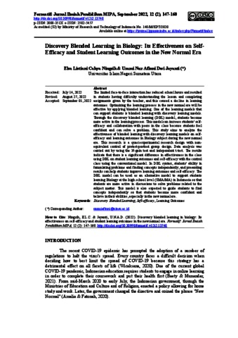 Ningsih, Elsa Listiani Cahya and Jayanti, Ummi Nur Afinni Dwi (2022) Discovery Blended Learning in Biology: Its Effectiveness on Self-Efficacy and Student Learning Outcomes in the New Normal Era. Formatif: Jurnal Ilmiah Pendidikan MIPA, 12 (2). pp. 147-160. ISSN p-ISSN: 2088-351X e-ISSN: 2502-5457