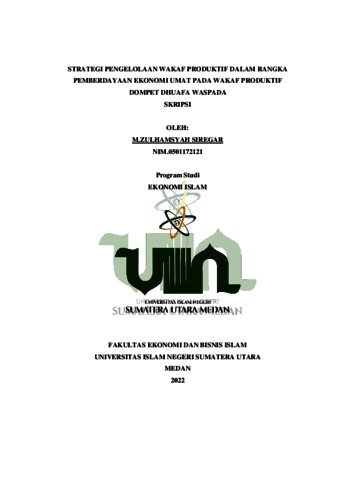 Siregar, M. Zulhamsyah (2022) Strategi Pengelolaan Wakaf Poduktif dalam Rangka Pemberdayaan Ekonomi Umat pada Wakaf Produktif Dompet Dhuafa Waspada. Skripsi thesis, Universitas Islam Negeri Sumatera Utara.