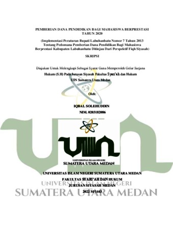 Solehuddin, Iqbal (2022) Pemberian Dana Pendidikan Bagi Mahasiswa Berprestasi Tahun 2020 (Implementasi Peraturan Bupati Labuhanbatu Nomor .7 Tahun 2013 Tentang Pedoman Pemberian Dana Pendidikan Bagi Mahasiswa Berprestasi Kabupaten Labuhanbatu Ditinjau Dari Perspektif Fiqh Siyasah). Skripsi thesis, Universitas Islam Negeri Sumatera Utara.