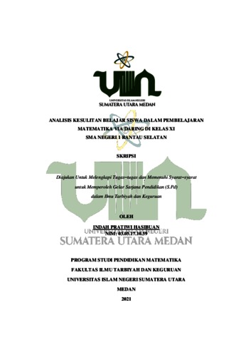 Hasibuan, Indah Pratiwi (2021) Analisis Kesulitan Belajar Siswa Dalam Pembelajaran Matematika Via Daring Di Kelas XI SMA Negeri 1 Rantau Selatan. Skripsi thesis, Universitas Islam Negeri Sumatera Utara.