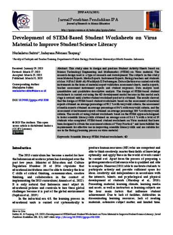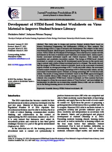 Safitri, Nurlailatus and Tanjung, Indayana Febriani (2023) Development of STEM-Based Student Worksheets on Virus Material to Improve Student Science Literacy. Jurnal Penelitian Pendidikan IPA, 9 (3). ISSN (e_ISSN: 2407-795X, p_ISSN: 2460-2582)