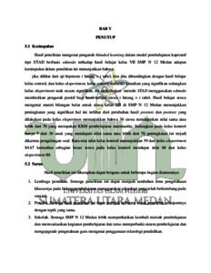 Penelitian ini dilatarbelakangi dengan rendahnya hasil belajar matematika terkhusus pada materi bilangan bulat kelas VII. Tujuan dari penelitian untuk mengetahui ada atau tidaknya pengaruh penggunaan Blended Learning dalam pembelajaran kooperatif tipe STAD berbasis Edmodo terhadap hasil belajar matematika siswa kelas VII. Penelitian yang digunakan adalah jenis penelitian eksperimen. Sampel penelitian ini ada 30 orang kelas VII A dan VII B SMP N 12 Negeri 12 Medan. Penelitian ini menggunakan treatment blended Learning dalam pembelajaran kooperatif tipe STAD berbasis Edmodo yang diberikan kepada siswa untuk mempengaruhi hasil belajar kelas VII. Hasil penelitian menunjukkan Blended learning dalam model pembelajaran koperatif tipe STAD berbasis edmodo memiliki pengaruh yang signifikan terhadap hasil belajar anak. Keadaaan ini dapat dilihat dari hasil uji hasil t hitung menunjukkan hasil 11.268 dan t tabel df 29 dengan taraf 0.05 1.710. Hasil belajar siswa mengenai materi bilangan bulat menunjukkan peningkatan yang signifikan hal ini terlihat dari perubahan hasil pre-test dan postest yang dilakukan pada kelas eksperimen menunjukkan bahwa 30 siswa mendapatkan nilai sama atau lebih dari 70 yang merupakan KKM pembelajaran matematika. Sedangkan pada kelas kontrol hanya 7 dari 30 amak yang mendapati nilai sama atau lebih dari 70 peningkatan ini terjadi dikarena pengulangan soal. Rata-rata nilai kelas kontrol menunjukkan 59 dan kelas eksperimen 84.67 kemudian sebagian besar siswa pada kelas kontrol mendapat nilai 60 dan kelas eksperimen 80.