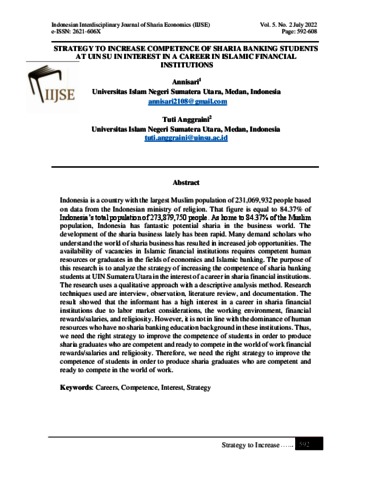 Annisari, Annisari and Anggraini, Tuti (2022) STRATEGY TO INCREASE COMPETENCE OF SHARIA BANKING STUDENTS AT UIN SU IN INTEREST IN A CAREER IN ISLAMIC FINANCIAL INSTITUTIONS. Indonesian Interdisciplinary Journal of Sharia Economics (IIJSE), 5 (2). pp. 592-608. ISSN 2621-606X