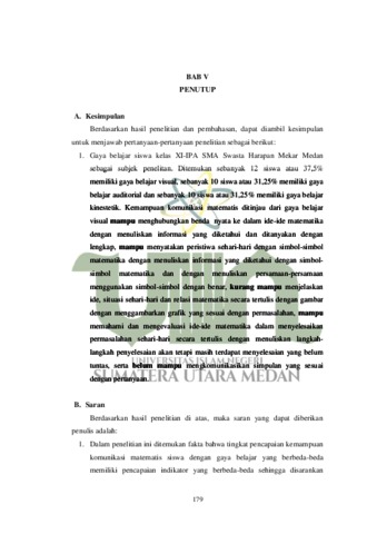 Kemampuan komunikasi matematis adalah kemampuan siswa untuk menyampaikan suatu pesan matematis dalam bahasa lisan dan.tulisan melalui peristiwa dialog atau hubungan yang terjadi di lingkungan kelas mengenai materi matematika yang dipelajari siswa. Gaya belajar adalah kecenderungan seseorang dalam menerima, menyerap, dan memproses informasi. Yang menjadi permasalahan yaitu kemampuan komunikasi matematis pada gaya belajar visual siswa. Penelitian ini adalah penelitian kualitatif. Subjek penelitian ini adalah 32 siswa kelas XI SMA Swasta Harapan Mekar Medan Kecamatan Medan Marelan yang berasal dari gaya belajar visual. Teknik pengumpulan data yang digunakan adalah angket, observasi, tes tertulis, dan dokumentasi. Indikator kemampuan komunikasi matematis pada tes tertulis antara lain: 1). Kemampuan menghubungkan benda nyata ke dalam ide-ide matematika, 2). Kemampuan menyatakan peristiwa sehari-hari dengan simbol-simbol matematika dalam menyajikan ide-ide matematis secara tertulis, 3). kemampuan menjelaskan ide, situasi sehari-hari dan relasi matematis, secara tertulis maupun dnegan gambar, 4). Kemampuan memahami dan mengevaluasi ide-ide matematis dalam menyelesaikan permasalahan sehari-hari secara tertulis, dan 5). Kemampuan mengkomunikasikan kesimpulan jawaban permasaahan sehari-hari sesuai dengan pertanyaan. Berdasarkan penelitian yang dilakukan pada kelas XI IPA Swasta Harapan Mekar Medan, ditemukan hasil 37,5% yang memiliki gaya belajar visual dengan jumlah sebanyak 12 siswa, 31,25% memiliki gaya belajar auditorial dengan jumlah 10 siswa dan 31,25% memiliki gaya belajar kinestetik dengan jumlah 10 siswa.