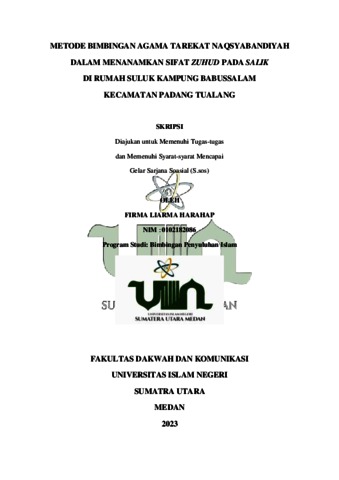Harahap, Firma Liarma (2023) Metode Bimbingan Agama Tarekat Naqsyabandiyah dalam Menanamkan Sifat Zuhud pada Salik di Rumah Suluk Kampung Babussalam Kecamatan Padang Tualang. Skripsi thesis, Universitas Islam Negeri Sumatera Utara.