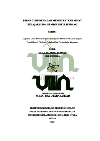 Saragih, Indah Zulfhani (2023) Peran Guru BK Dalam Meningkatkan Minat Belajar Siswa di MTsN 2 Deli Serdang. Skripsi thesis, Universitas Islam Negeri Sumatera Utara.