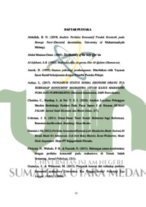 Skripsi berjudul “Perilaku Konsumtif Mahasiswa dalam Membeli Produk Fashion Syariah Studi Kasus Mahasiswi FEBI UINSU”. Atas nama Windi Jihan Nabila. Di bawah bimbingan Ibuk Nurbaiti, M.kom sebagai pembimbing I dan Bapak Muhammad Ikhsan Harahap, M.E.I sebagai pembimbing II. Tujuan dari penelitian ini adalah untuk mengetahui perilaku konsumtif dalam membeli produk fashion pada mahasiswa Jurusan Ekonomi Islam Universitas Islam Negeri Sumatera Utara. Informan penelitian ini adalah Mahasiswa Jurusan Ekonomi Islam, stambuk 2018-2021, suka berbelanja. termasuk kategori perilaku konsumtif. Metode pengambilan menggunakan angket ataupun wawancara. Hasil penelitian yang didapat, seluruh subjek menunjukkan perilaku konsumtif saat melihat produk fashion yang bagus didepan matanya. Perilaku konsumtif tersebut terjadi diawali oleh faktor yang mempengaruhi gaya belanja subjek yaitu faktor lingkungan, faktor internal, dan perkembangan mode. Subjek membeli bukan karena kebutuhan melainkan keinginannya, dan subjek cenderung sering melakukan pembelian secara tiba-tiba. Subjek tidak memikirkan apakah barang-barang dirumah atau dikost masih berfungsi, mudah tergiur atau tertarik denga produk fashion yang orang lain pakai, tidak dapat mengontrol diri, dan membeli karena ingin mengikuti trend. Subjek membeli produk bukan yang diutamakan. Perilaku yang tidak disadari itu membuat subjek cenderung menjadi konsumtif dalam berbelanja. Dampak atau akibat yang dirasakan subjek yaitu boros. Dikatakan boros karena subjek menghabiskan uang untuk membeli sesuatu yang bukan diprioritaskan.
