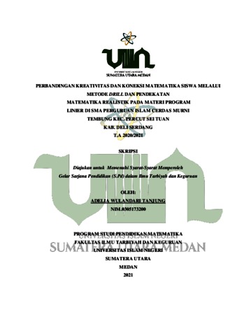 Tanjung, Adelia Wulandari (2021) Perbandingan Kreativitas dan Koneksi Matematika Siswa Melalui Metode Drill dan Pendekatan Matematika Realistik Pada Materi Sistem Persamaan Linier Dua Variabel di SMA Perguruan Islam Cerdas Murni Tembung Kec. Percut Sei Tuan Kab.Deli Serdang T.A 2020/2021. Skripsi thesis, Universitas Islam Negeri Sumatera Utara.