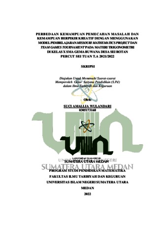 Wulandari, Suci Amallia (2022) Perbedaan Kemampuan Pemecahan Masalah Dan Kemampuan Berpikir Kreatif Dengan Menggunakan Model Pembelajaran Missouri Mathematics Project Dan Team Games Tournament Pada Materi Trigonometri Di Kelas X SMA Gema Buwana Desa Sei Rotan Percut Sei Tuan T.A 2021/2022. Skripsi thesis, Universitas Islam Negeri Sumatera Utara.