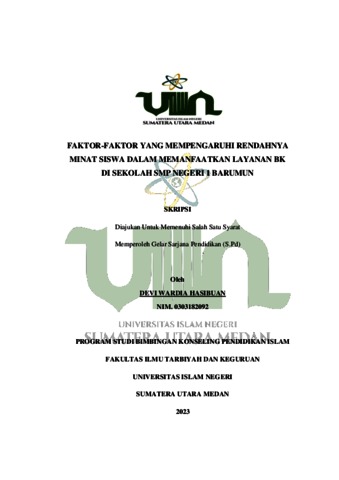 Hasibuan, Devi Wardia (2023) Faktor-faktor Yang Mempengaruhi Rendahnya Minat Siswa Dalam Memanfaatkan Layanan BK Di Sekolah SMP Negeri 1 Barumun. Skripsi thesis, Universitas Islam Negeri Sumatera Utara.