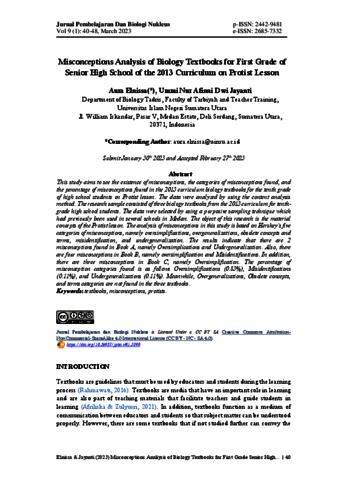 Elnissa, Aura and Jayanti, Ummi Nur Afinni Dwi (2023) Misconceptions Analysis of Biology Textbooks for First Grade of Senior High School of the 2013 Curriculum on Protist Lesson. Jurnal Pembelajaran Dan Biologi Nukleus, 9 (1). pp. 40-48. ISSN p-ISSN: 2442-9481 e-ISSN: 2685-7332