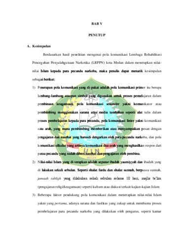skripsi ini adalah hasil penelitian lapangan mengenai “Pola Komunikasi Pencegahan Penyalahgunaan Narkotika (LRPPN) kota Medan Dalam Menerapkan Nilai-nilai Islam Kepada Para Pecandu Narkoba. dengan rumusan masalah: pertama, apa pola komunikasi yang digunakan Lembaga Rehabilitasi Pencegahan Penyalahgunaan Narkotika (LRPPN) kota Medan dalam menerapkan nilai-nilai islam kepada para pecandu narkoba. kedua, bagaimana hambatan Lembaga Rehabilitasi Pencegahan Penyalahgunaan Narkotika (LRPPN) kota Medan dalam Menerapkan Nilai-Nilai Islam Kepada Para Pecandu Narkoba. Adapun jenis penelitian yang digunakan dalam penelitian ini adalan pendekatan kualitatif. dimana data yang dikumpulkan di peroleh melalui hasil observasi dan wawancara. kemudian data yang telah diperoleh di analisis dengan menggunakan metode deskriptif dan analisis dengan pola fikir induktif, yaitu menganalisis data-data yang yang bersifat khusus kemudian di tarik kesimpulan yang bersifat umum yang berkaitan dengan Pola Komunikasi Lembaga Rehabilitasi Pencegahan Penyalahgunaan Narkotika (LRPPN) kota Medan dalam Menerapkan Nilai-Nilai Islam Kepada Para Pecandu Narkoba . Dari penelitian ini di simpulkan bahwa Pola Komunikasi Lembaga Rehabilitasi Pencegahan Penyalahgunaan Narkotika (LRPPN) kota Medan dalam Menerapkan Nilai-NilaiIslam Kepada Pecandu Narkoba ada 4 yakni; pola komunikasi primer, sekunder, linier, dan silkular. Dari proses penerapan Pola Komunikasi tersebut, secara tidak langsung Lembaga Rehabilitasi Pencegahan Penyalahgunaan Narkotika (LRPPN) kota Medan melakukan pembinaan yang bertujuan untuk mengenali karakter pasien pecandu narkoba lebih dalam, sehingga lebih mudah memberikan pembinaan religi maupun pembinaan mengenai aturan hidup yang benar. Adapun nilai-nilai Islam yang diterapkan oleh lembaga kepada pasien yang beragama Islam adalah merutinkan agar melaksanakan ibadaha sholat fardhu, puasa sunnah senin kamis, khuruj (melakukan safar dakwah keluar area rehabilitasi), dan ta`lim (pengajaran ilmu agama).
