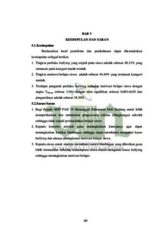 Penelitian yang telah dilakukan berjudul “Pengaruh Perilaku Bullying Terhadap Motivasi Belajar Siswa Di Smp Pab 19 Manunggal Deli Serdang”, yang dilatar belakangi dengan bagaimana Perilaku bullying dapat menghancurkan semangat dan motivasi siswa dan terutama menciptakan situasi yang tidak nyaman unuk belajar. Motivasi belajar siswa yang menjadi lemah dan lemahnya motivasi atau tiadanya motivasi belajar tersebut akan melemahkan kegiatan, sehingga mutu prestasi belajar akan rendah Metodologi penelitian menggunakan penelitian kuantitatif korelasional yang bertujuan melihat pengaruh perilaku bullying terhadap motivasi belajar siswa. Sedangkan yang akan dijadikan subjek penelitian adalah keseluruhan dari sumber informasi yang dapat memberikan data yaitu Guru Bimbingan dan Konseling, Guru Bidang Studi, dan 27 siswa SMP PAB 19 Manunggal. Teknik pengambilan data didasarkan pada kriteria yang ditetapkan oleh peneliti, yaitu dengan cara observasi, penyebaran angket dan dokumentasi. Hasil penelitian mengungkapkan bahwa Pengaruh Perilaku Bulyying Terhadap Motvasi Belajar Siswa Si Smp Pab 19 Manunggal (1)Tingkat perilaku bullying yang terjadi pada siswa adalah sebesar 48,15% yang termasuk pada kategori masih rendah.(2)Tingkat motiavsi belajar siswa adalah sebesar 44,44% yang termasuk kategori rendah.(3)Terdapat pengaruh perilaku bullying terhadap motivasi belajar siswa dengan angka Thitung sebesar 3,941 dengan nilai signifikan sebesar 0,001<0,05 dan pengaruhnya adalah sebesar 38,30%.