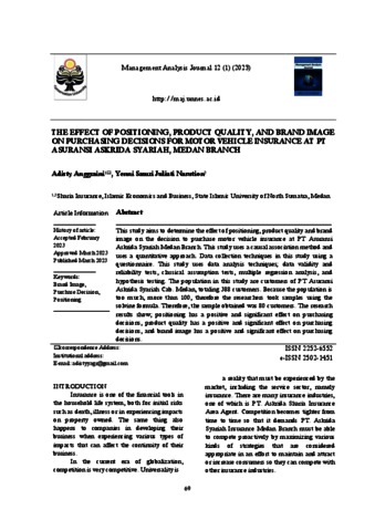 Anggraini, Adisty (2023) The effect of positioning, product quality, and brand image on purchasing decisions for motor vehicle insurance at PT asuransi askrida syariah, Medan Branch. Management Analysis Journal, 12 (1). ISSN P 2252-6552, E 2502-1451