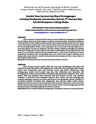 Rorizki, Fitri and Nasution, Yenni Samri Juliati (2023) Analisis Dana Investasi dan Biaya Pertanggungan terhadap Pendapatan Asuransi Jiwa Syariah: PT Asuransi Jiwa Syariah Bumiputera Cabang Medan. Al-Kharaj: Jurnal Ekonomi, Keuangan & Bisnis Syariah, 5 (4). ISSN 2656-4351