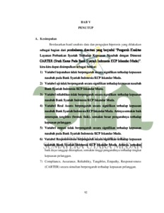 Atas nama Alhafis di bawah Bimbingan Skripsi I Bapak Dr. Mustapa Khamal Rokan, M.H dan Ibu Rahmi Syahriza, S.Th. I. MA sebagai Pembimbing Skripsi II. Tujuan dari penelitian ini adalah untuk menguji bagaimana kepuasan nasabah Bank Syariah KCP Iskandar Muda dipengaruhi oleh kualitas layanan dengan menggunakan model Carter. Tingkat kepuasan pelanggan sangat penting dalam membangun kualitas layanan. Persaingan semakin ketat seiring dengan kemajuan teknologi. Oleh karena itu, memperoleh kebahagiaan klien tergantung pada kualitas layanan. Sebagai salah satu lembaga keuangan syariah, bank syariah dituntut untuk terus meningkatkan kualitas layanan yang diberikannya, termasuk bagaimana menerapkan CARTER, yang merupakan singkatan dari“Compliance (kepatuhan), Assurance (jaminan), Reliability (keandalan), Tangibles ( bentuk fisik), Empati (peduli), dan Responsiveness (daya tanggap)". Karena layanan merupakan elemen yang dirasakan langsung oleh konsumen, kualitas layanan sangat penting untuk kelangsungan hidup bank dalam jangka panjang. Penelitian kuantitatif sedang dilakukan. Data utama yang digunakan dikumpulkan melalui survei yang diberikan kepada klien BSI KCP Iskandar Muda. 96 sampel ditemukan dengan menggunakan strategi purposive sampling. Regresi linier berganda dan pengujian hipotesis, termasuk uji pengaruh simultan (uji F), koefisien determinasi, dan uji pengaruh parsial, digunakan dalam pendekatan analisis data (uji t). SPSS 25 digunakan untuk mengolah data. Menurut temuan, kebahagiaan pelanggan dipengaruhi secara positif olehtangibles (bentuk fisik) dan responsiveness (daya tanggap). Sementara ini terjadi, empat variabel lainnya, Assurance (jaminan), Reliability (keandalan), dan Empathy (care) tidak memiliki dampak yang menguntungkan terhadap kepuasan pelanggan.
