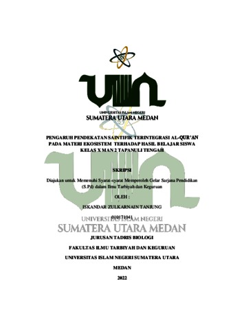 Tanjung, Iskandar Zulkarnain (2022) Pengaruh Pendekatan Saintifik Terintegrasi Al- Qur’an Pada Materi Ekosistem Terhadap Hasil Belajar Siswa Kelas X MAN 2 Tapanuli Tengah. Skripsi thesis, Universitas Islam Negeri Sumatera Utara.