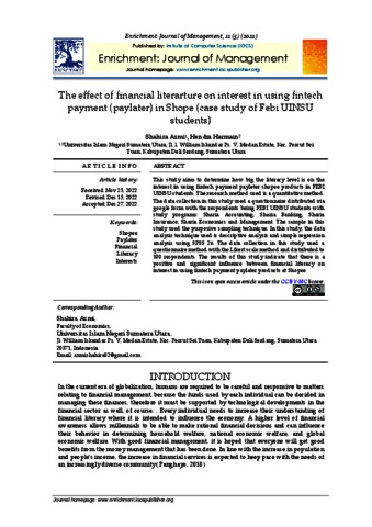 Azmi, Shahira and Harmain, Hendra (2022) The effect of financial literarture on interest in using fintech payment (paylater) in Shope (case study of Febi UINSU students). Enrichment: Journal of Management, 12 (5). ISSN 2087-6327 (Print)|2721-7787 (Online)