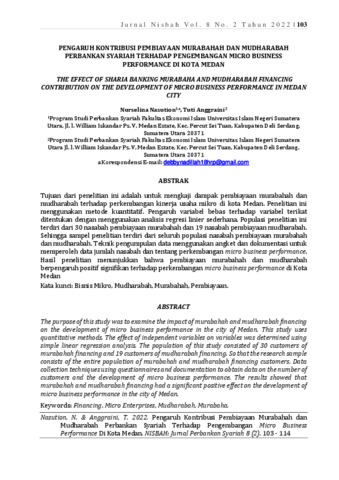 Nasution, Nurselina and Anggraini, Tuti (2022) Pengaruh Kontribusi Pembiayaan Murabahah Dan Mudharabah PerbaPengaruh Kontribusi Pembiayaan Murabahah Dan Mudharabah Perbankan Syariah Terhadap Pengembangan Micro Business Performance Di Kota Medannkan Syariah Terhadap Pengembangan Micro Business Performance Di Kota Medan. Jurnal Nisbah, 8 (2). ISSN p-ISSN 2442-4455 & e-ISSN 2528-6633