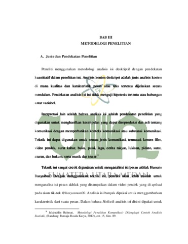 Penelitian ini bertujuan untuk mengetahui isi pesan akhlak yang terdapat pada video di media sosial tik-tok Hussein Basyaiban pada bulan September-Oktober 2021. Untuk mengetahui apakah didalam video tersebut memiliki tema-tema pesan akhlak yang menjadi kategori tema pesan akhlak didalam agama Islam. Untuk mengetahui apa saja isi pesan akhlak yang disampaikan dalam video Hussein Basyaiban pada bulan September-Oktober 2021. Temuan hasil dari penelitian ini adalah terdapat tiga tema pesasn akhlak yang disampaikan yaitu, Akhlak kepada Allah, Akhlak kepada sesama manusia dan Akhlak kepada lingkungan selain itu terdapat pula beberapa isi pesan akhlak yang disampaikan Hussain Basyaiban dengan persentase tertinggi pembahasan pesan akhlak yaitu Ghibah sebesar 30%, Dzolim sebesar 25%, terakhir mencari kesalahan sesama dan menyebar fitnah 10%. Sedangkan isi pesan akhlak lainnya memilki persentase terendah yaitu 5% dari jumlah total 15 isi pesan akhlak yang tersedia dalam coding sheet. Untuk mencapai penelitian di atas maka dalam skripsi ini peneliti menggunakan metode penelitian Analisis isi pendekatan deskriptif Kuantitatif. Dalam menganalisis data, peneliti membuat lembar koding berisi kategorisasi pesan akhlak yang terkandung video Husssein Basyaiban yang kemudian dilakukan pengujian kategori pada dua orang juri atau coder yang dipandang kredibel. Data yang sudah terkumpul diperoleh dari peniaian dan hasil kesepakatan juri akan diamati, dihitung, dan diberi nilai untuk mengetahui tema dan isi pesan akhak yang disampaikan beserta frekuensi dan koefisien reabilitas tiap juri hingga hasil persentase isi pesan akhlak apa yang paling dominan dalam video tersebut.