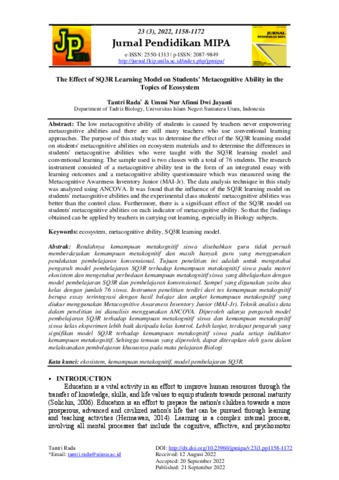 Rada, Tantri and Jayanti, Ummi Nur Afinni Dwi (2022) The Effect of SQ3R Learning Model on Students' Metacognitive Ability in the Topics of Ecosystem. Jurnal Pendidikan MIPA, 23 (3). ISSN e-ISSN: 2550-1313 | p-ISSN: 2087-9849