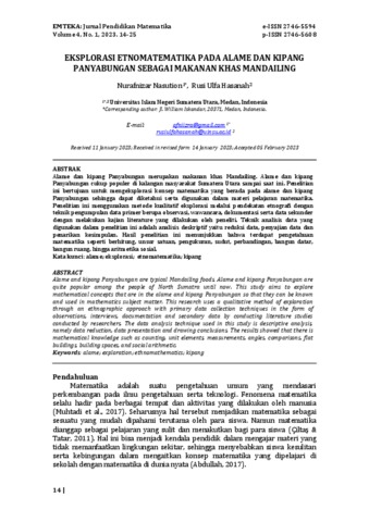 Nasution, Nurafnizar and Hasanah, Rusi Ulfa (2023) Eksplorasi Etnomatematika Pada Alame Dan Kipang Panyabungan Sebagai Makanan Khas Mandailing. Emteka : Jurnal Pendidikan Matematika, 4 (1). pp. 14-25. ISSN e-ISSN 2746-5594, p-ISSN 2746-5608