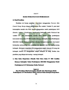 Penelitian ini bertujuan untuk mengetahui Pengaruh Model Pembelajaran SAVI (Somatic, Auditory, Visualization, Intellectualy) Berbantuan Media Flashcard Terhadap Kemampuan Menulis Puisi Siswa Kelas IV MIS Cendikia Bunayya Kabanjahe Tahun Pembelajaran 2022/2023 .Populasi penelitian ini adalah seluruh Siswa Kelas IV MIS Cendikia Bunayya Kabanjahe berjumlah 116 siswa. Sampel dalam penelitian ini berjumlah 56 siswa yang diambil dengan teknik random sampling (acak kelas). Metode penelitian yang digunakan adalah metode eksperimen quasi dengan desain two group post-test only control design. Instrumen yang digunakan adalah tes menulis puisi dalam bentuk tes essay. Hasil pengolahan data menunjukkan adanya perbedaan hasil kemampuan menulis laporan hasil observasi.Tes pada kelas kontrol dengan nilai rata-rata 65,17, standar deviasi 11,13 dan standar error 2,14 sedangkan kelas eksperimen dengan nilai rata-rata 80,00, standar deviasi 10,08 dan standar error 1,94. Pengujian hipotesis dilakukan dengan menggunakan uji “t” dari perhitungan uji hipotesis diperoleh thitung= 74,15, selanjutnya disesuaikan dengan tabel t pada taraf signifikan 5% dengan dk = (N1 + N2) – 2 = (28 + 28) – 2 = 54. Pada tabel t dengan dk = 54 diperoleh taraf signifikan 5% = 1,67. Karena thitung yang diperoleh lebih besar dari ttabel yaitu 74,15> 1,67 maka hipotesis nihil (H0) ditolak dan hipotesis alternatif (Ha) diterima. Hal ini membuktikan bahwa model SAVI (Somatic, Auditory, Visualization, Intellectualy) berbantuan media Flashcard berpengaruh digunakan terhadap kemampuan menulis puisi siswa kelas IV MIS Cendikia Bunayya Tahun Pembelajaran 2022/2023