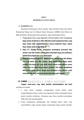 Analisis Biaya Produksi Dan Laba Dalam Menentukan Harga Jual Air Minum Dalam Kemasan (AMDK) Pada Pabrik Air Mineral Madina (Study Kasus CV. Madina Murni)