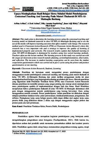 Arlina, Arlina and Azima, A Zeni and Sembiring, Diky Ananta and Rizky, Juan Adji and Koto, Hiayatul Fikri (2023) Upaya Meningkatkan Hasil Belajar Siswa Melalui Model Pembelajaran Contextual Teaching And Learning Pada Materi Thaharah Di MTs Al-Muttaqiin Besitang. Jurnal Pendidikan Berkarakter, 1 (4). ISSN 2988-1129