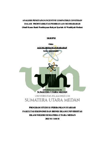 Harahap, Agung Setiawan (2023) Analisis penetapan Incentiv Compatible Contrain Dalam Profitabilitas Pembiayaan Mudharabah (Studi Kasus Bank Pembiayaan Rakyat Syariah Al Washliyah Medan). Skripsi thesis, Universitas Islam Negeri Sumatera Utara Medan.