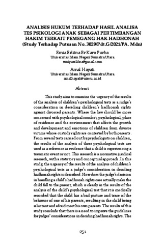 Br. Karo Purba, Emia Erlitna and Hayati, Amal (2022) Analisis hukum terhadap hasil analisa tes psikologi anak sebagai pertimbanagan hakim terkait pemegang hak hadhonah (Study Terhadap Putusan No. 3029/Pdt.G/2021/PA. Mdn). Ijtihad: Jurnal Hukum dan Ekonomi Islam, 16 (2). pp. 251-273.