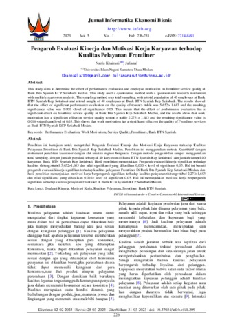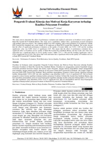 Khairani, Nazla and Juliana, Juliana (2023) Pengaruh Evaluasi Kinerja dan Motivasi Kerja Karyawan terhadap Kualitas Pelayanan Frontliner. Jurnal Informatika Ekonomi Bisnis, 5 (1). pp. 221-231. ISSN 2714-8491