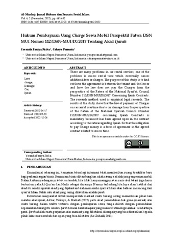 Hukum Pembayaran Uang Charge Sewa Mobil Perspektif Fatwa DSN MUI Nomor 112/DSN-MUI/IX/2017 Tentang Akad Ijarah