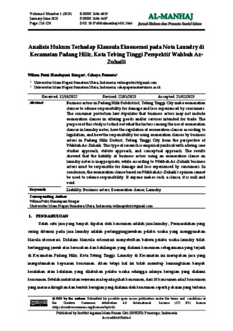Siregar, Wilma Putri Handayani and Permata, Cahaya (2023) Analisis Hukum Terhadap Klausula Eksonerasi pada Nota Laundry di Kecamatan Padang Hilir, Kota Tebing Tinggi Perspektif Wahbah Az-Zuhaili. Al-Manhaj: Jurnal Hukum Dan Pranata Sosial Islam, Vol.5 (No.1). pp. 228-215. ISSN 2686-4819