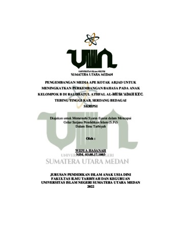 Hasanah, Widya (2022) Pengembangan Media APE Kotak Abjad untuk Meningkatkan Perkembangan Bahasa Pada Anak Kelompok B Raudhatul Atfhal Al Musa’adah Kec. Tebing Tinggi Kab. Sedang Bedagai. Skripsi thesis, Universitas Islam Negeri Sumatera Utara Medan.
