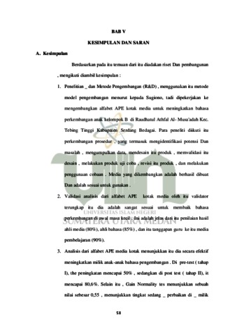 Penelitian ini bertujuan untuk mengembangkan dan menghasilkan produk media pembelajaran media APE kotak abjad pada anak kelompok B. Penelitian ini menggunakan 3 rumusan masalah yaitu: 1) bagaimana cara mengembangkan media APE kotak abjad untuk anak usia dini, 2) apakah media APE kotak abjad layak digunakan untuk anak usia dini, dan 3) apakah media APE kotak abjad dapat meningkatkan perkembangan bahasa anak usia dini di kelompok B RA AL�Musa‟adah Kec. Tebing Tinggi Kab. Serdang Bedagai. Penelitian ini merupakan model penelitian R & D atau Research and Development adalah metode penelitian yang digunakan untuk menghasilkan produk tertentu, dan menguji keefektifan produk tersebut. Untuk dapat menghasilkan produk tertentu digunakan penelitian yang bersifat analisis kebutuhan dan untuk menguji keefektifan produk terebut. Strategi penelitian pengembangan ini menurut Sugiono yaitu, sebagai berikut: 1) Potensi dan masalah; 2) Pengumpulan data; 3) Desain Produk; 4) Validasi Desain; 5) Uji coba Produk; 6) Revisi Produk; 7) Uji coba pemakaian. Hasil penelitian Pengembangan media APE kotak abjad 1) cara mengembangkan media APE kotak abjad melalui 7 tahap, 2) hasil analisis penilaian validasi ahli media 80%, ahli bahasa 85%, dan respon guru terhadap media pembelajaran 90%, 3) media APE kotak abjad dapat meningkatkan perkembangan bahasa anak sebesar 80,6%. Kemudian melalui hasil uji Normailitas Gain untuk melihat seberapa besar peningkatan hasil belajar anak sebelum dan sesudah menggunakan media APE kotak abjad. Hasil uji Normalitas Gain mencapai nilai 0,55 dengan kriteria sedang. Sehingga dapat dikatakan bahwa media APE kotak abjad yang dikembangkan efektif.