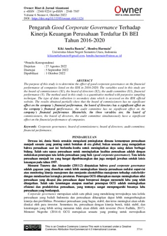 Bancin, Kiki Amelia and Amelia, Kiki (2022) Pengaruh Good Corporate Governance terhadap Kinerja Keuangan Perusahaan Terdaftar di BEI Tahun 2016-2020. Owner: Riset & Jurnal Akuntansi, Vol.6 (No.4). pp. 3714-3723. ISSN 2548-9224