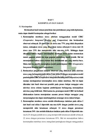 Penelitian yang telah dilakukan berjudul “Upaya Meningkatkan Keterampilan Membaca Siswa dengan Menggunakan Model CIRC (Cooperative Integrated Reading and Composition) di Kelas IV MIS NU Pasar Batu Gerigis”, sesuai dengan rumusan masalah, penelitian ini bertujuan untuk mengetahui: (1) Keterampilan membaca siswa pada pembelajaran bahasa indonesia sebelum menggunakan model CIRC, (2) Penerapan model CIRC dalam meningkatkan keterampilan membaca siswa pada pembelajaran bahasa indonesia, (3) Keterampilan membaca siswa pada pembelajaran bahasa indonesia setelah menggunakan model CIRC. Metode yang digunakan peneliti dalam penulisan ini menggunakan Penelitian Tindakan Kelas (PTK). Penelitian ini dilakukan di MIS NU Pasar Batu Gerigis Kecamatan Barus. Penelitian ini dilakukan bersiklus, setiap siklus terdiri dari empat tahap yaitu perencanaan, pelaksanaan tindakan, observasi, dan refleksi. Subjek dalam penelitian ini adalah siswa kelas IV MIS NU Pasar Batu Gerigis T.P 2022/2023 yang berjumlah 26 orang siswa, 16 orang siswa laki-laki dan 10 orang siswa perempuan. Sedangkan objek penelitian ini adalah meningkatkan keterampilan membaca siswa dengan menggunakan model pembelajaran CIRC (Cooperative Integrated Reading and Composition) pada mata pelajaran bahasa indonesia. Teknik pengumpulan data yang digunakan penulis yaitu dengan menggunakan lembar observasi, tes, dan dokumentasi. Hasil penelitian yang dilakukan di MIS NU Pasar Batu Gerigis menunjukkan bahwa: 1) Keterampilan membaca siswa sebelum menggunakan model pembelajaran CIRC belum memuaskan dimana hanya 6 siswa dengan persentase ketuntasan klasikal sebesar 23% dengan nilai rata-rata 4,4. 2) Keterampilan membaca siswa setelah menggunakan model pembelajaran CIRC pada siklus I ketuntasan belajar siswa sebanyak 14 siswa dengan persentase ketuntasan klasikal 54% dengan nilai rata�rata 6,0. Selanjutnya pada siklus II keterampilan membaca siswa lebih meningkat lagi, dengan jumlah siswa yang tuntas sebanyak 22 siswa dengan persentase ketuntasan klasikal 85% dengan nilai rata-rata 8,2. Berdasarkan hasil di atas, hal ini menunjukkan bahwa dengan menggunakan model pembelajaran CIRC pada pembelajaran bahasa indonesia mampu meningkatkan keterampilan membaca siswa pada kelas IV MIS NU Pasar Batu Gerigis yang telah mencapai tingkat ketuntasan belajar klasikal 85% dan dapat dinyatakan tuntas.