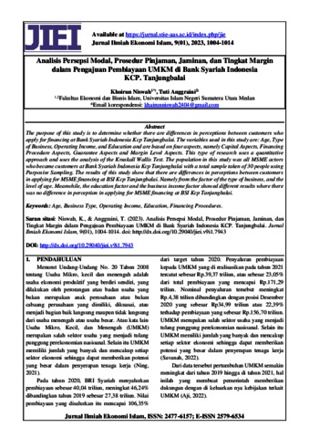 Niswah, Khoirun and Anggraini, Tuti (2023) Analisis Persepsi Modal, Prosedur Pinjaman, Jaminan, dan Tingkat Margin dalam Pengajuan Pembiayaan UMKM di Bank Syariah Indonesia KCP. Tanjungbalai. Jurnal Ilmiah Ekonomi Islam, 9 (1). pp. 1004-1014. ISSN 2477-6157