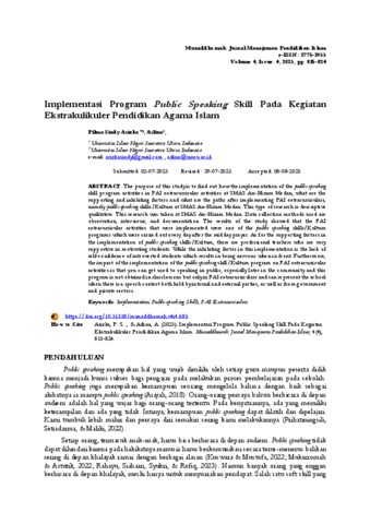 Arizka, Pilma Sindy and Arlina, Arlina (2023) Implementasi Program Public Speaking Skill Pada Kegiatan Ekstrakulikuler Pendidikan Agama Islam. Munaddhomah: Jurnal Manajemen Pendidikan Islam, 4 (4). pp. 815-824. ISSN 2775-2933